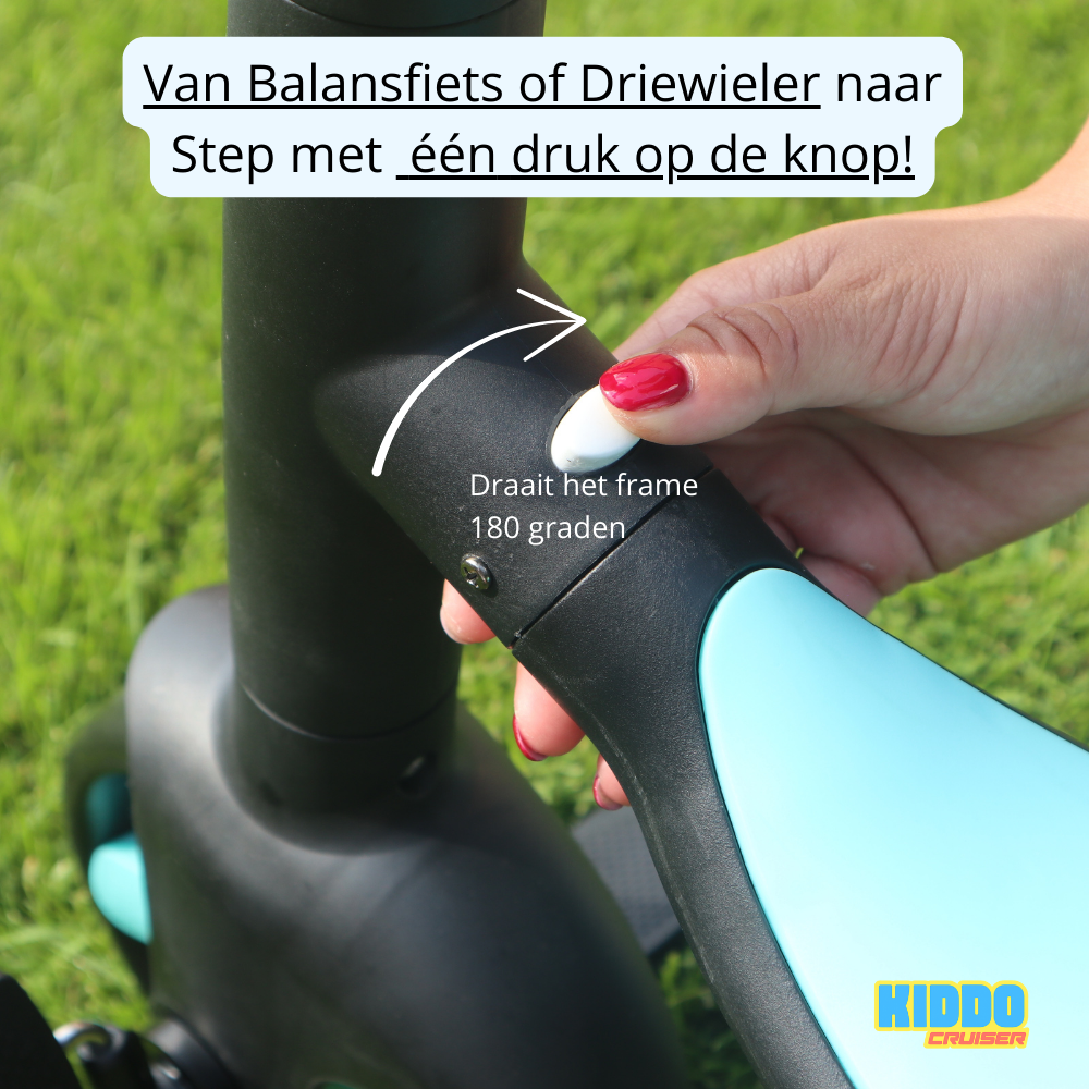 De KiddoCruiser groeit met je kindje mee. In minder dan 3 seconden switch je van step naar balansfiets of driewieler met pedalen, zonder tools, zonder moeite.
