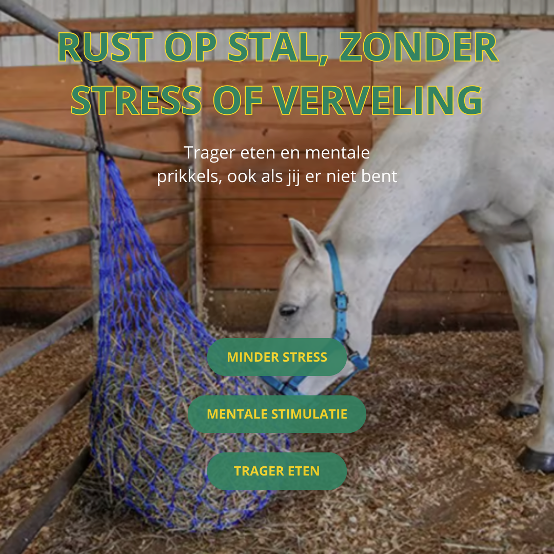 De net houdt je paard mentaal bezig. In plaats van onrustig op en neer lopen of op deuren knabbelen, heeft het een leuke uitdaging die spanning wegneemt.
