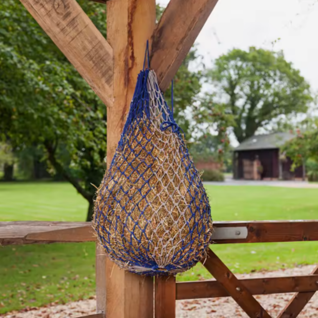 Door de fijne mazen moet het paard het hooi plukje per plukje uit het net halen, in plaats van alles in één keer te eten.