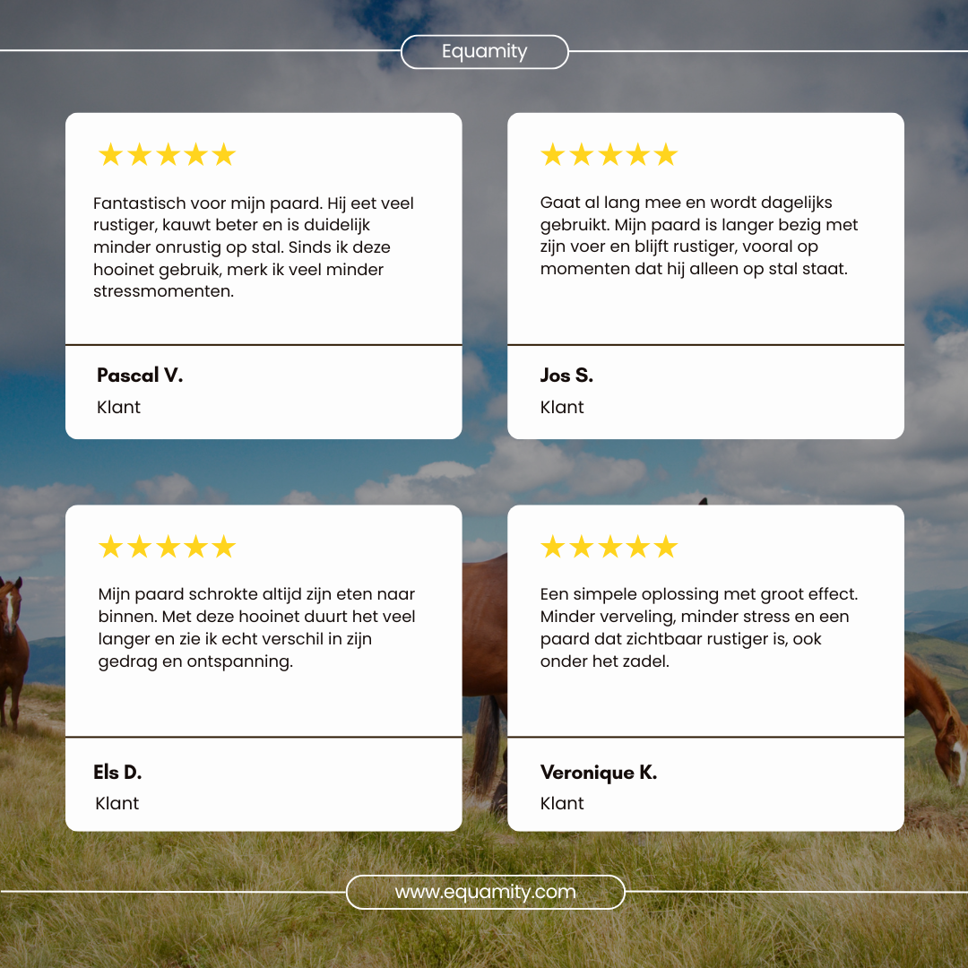 In het begin was ik aan het twijfelen. Toch ben ik positief verrast. De materialen voelen stevig aan en zijn duidelijk gemaakt voor intensief stalgebruik. Mijn paard eet merkbaar trager en staat langer bezig met zijn ruwvoer, wat vooral bij boxrust een groot voordeel is. Enige minpuntje is dat je even moet leren hoe je alles het handigst gebruikt, maar eens dat routine wordt, wil je niet meer terug.